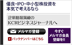 特選銘柄アナリストレポート2012年1月号を掲載しました。(有料)KCAMレポート会員サイトはこちらをご覧下さい。 JLPI正会員サイトはこちらをご覧下さい。 無料アナリストレポート読み放題IRチャンネル会員サイトはこちらをご覧ください。 ロイターリサーチレポートサイトはこちらをご覧ください。